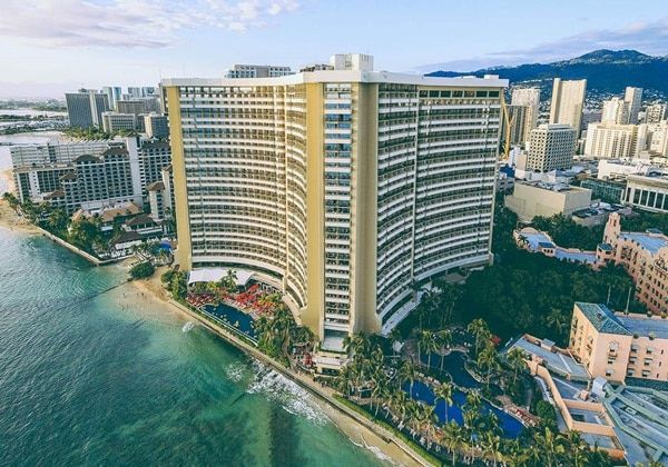 ワイキキビーチに翼を広げたように立つ、ハワイ屈指の大型リゾートホテル「シェラトン ワイキキ ビーチリゾート」。