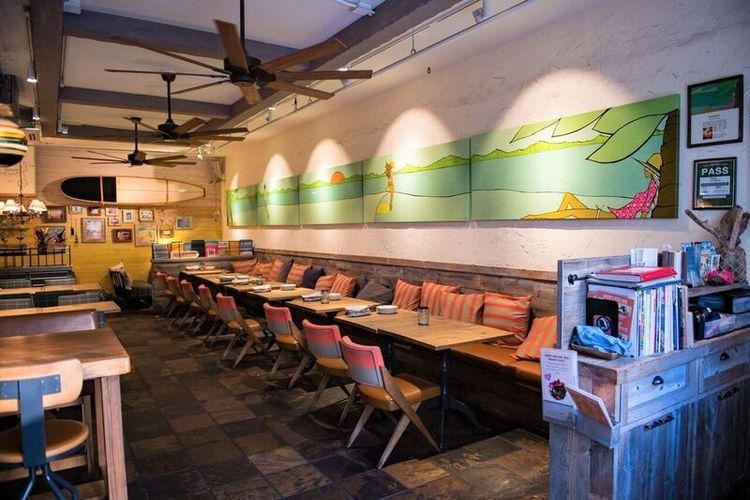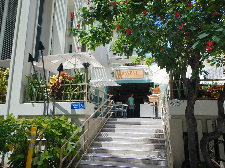 「ヘブンリー・アイランド・ライフスタイル」はワイキキ中心部にあるオーガニックと地産地消にこだわるレストラン。ショアラインホテル脇の階段を上ると、サーフテイスト満載のウッディなレストランが現れます。壁一面にはサーフ・アーティストのアンディ・デイビスの作品が並び、サーフボードもディスプレイされ、ビーチテイストにまとめられた店内にはのんびりした時間が流れています。